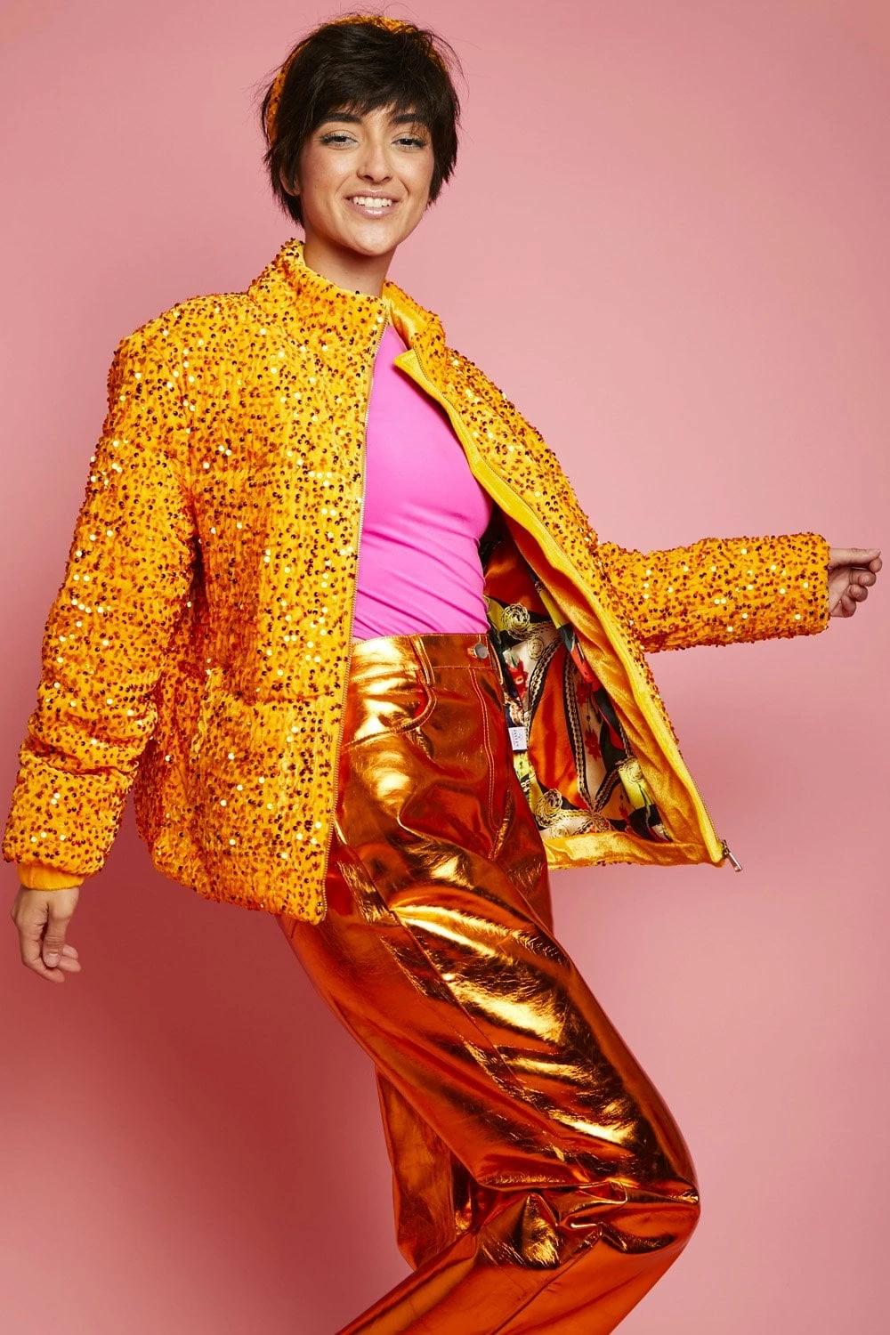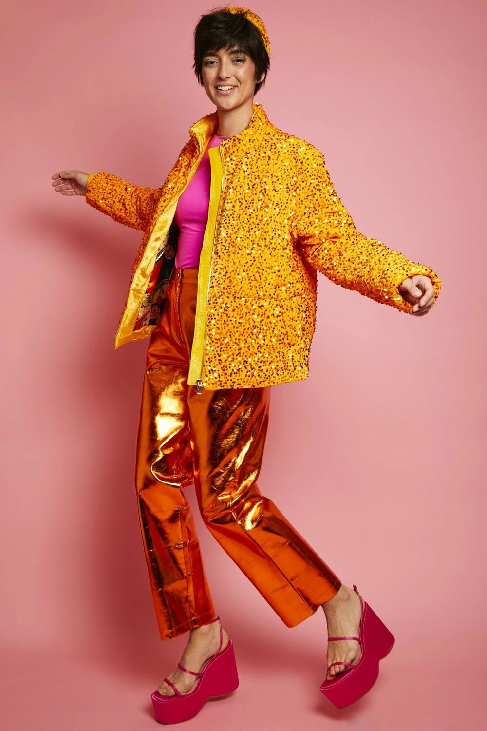 Sequin ribbed texture will elevate all your day-to-night looks! Cropped length with zip and press stud fastening. We just love how this instantly adds sparkle to your outfit!