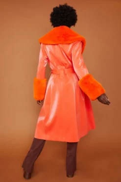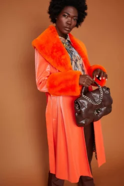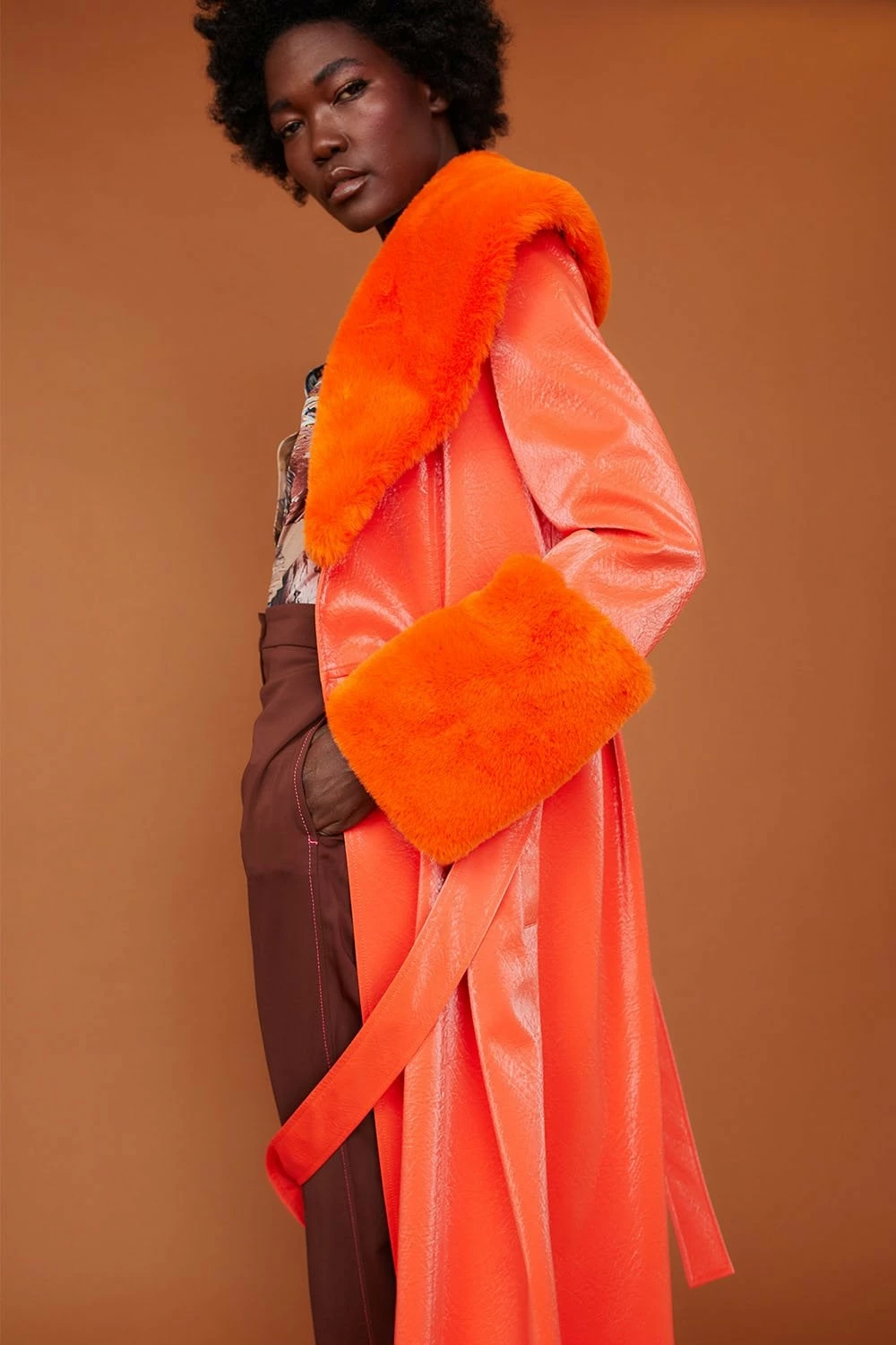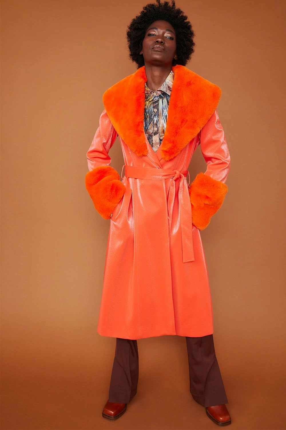 Super on-trend this yellow midi style trench coat will give you the vibes you need throughout the cooler weather. The brushed, soft, faux leather is embossed with snake print and features a detachable faux fur collar and cuffs so you get two look for the price of one!
