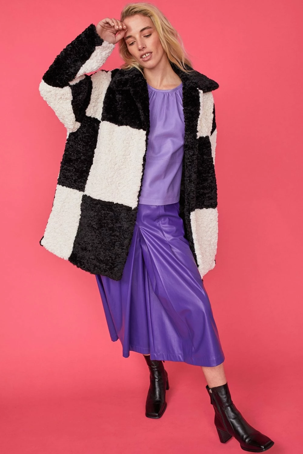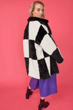 This oversized faux shearling coat is guaranteed to keep you warm and cosy whilst you look super cool. The contrasting Black and White checked pattern adds plenty of interest and the pockets and large statement buttons makes it a practical choice too.