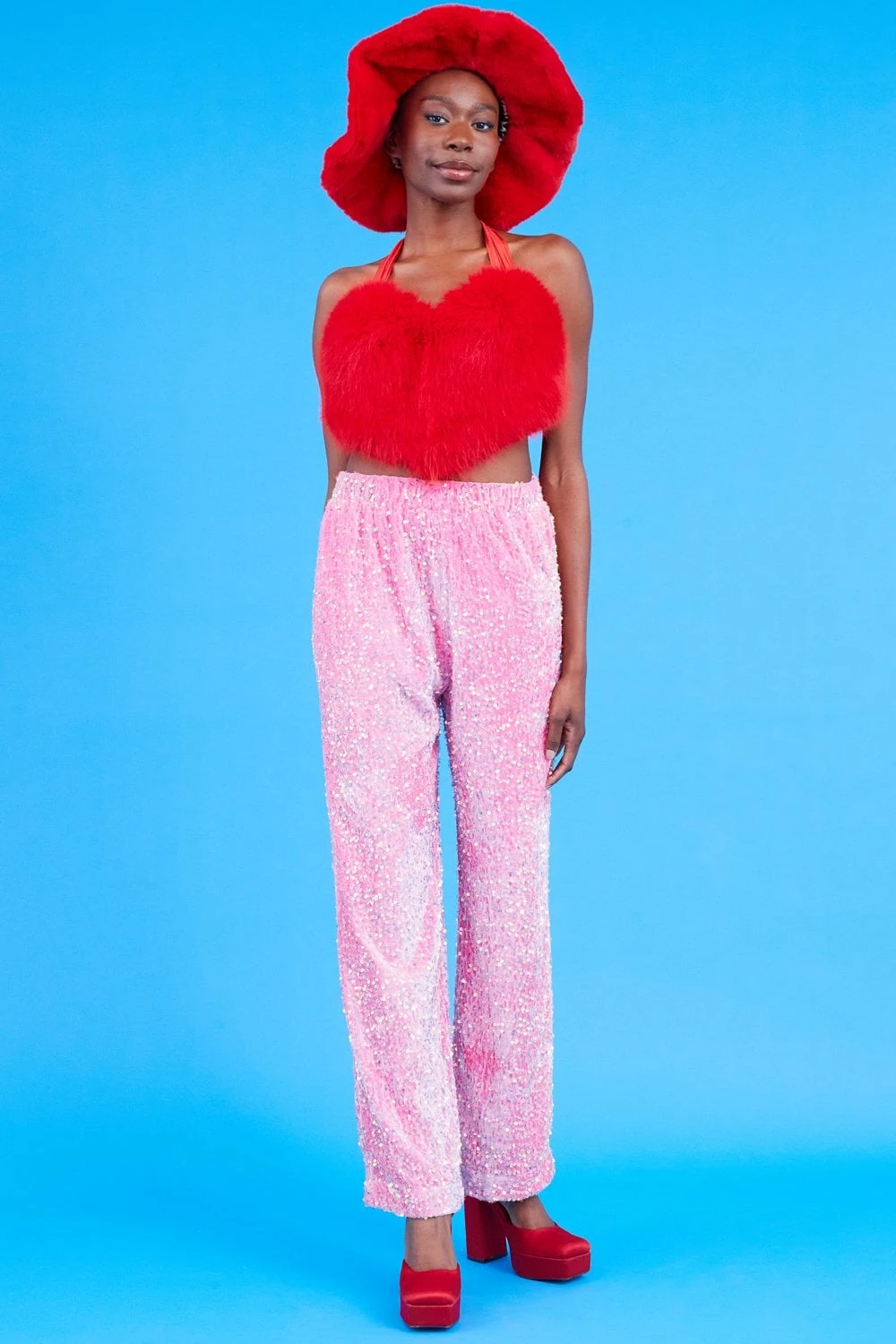 Velvety embellished trousers featuring sequin embroidery, a high elasticated waist, silk lining and pockets.