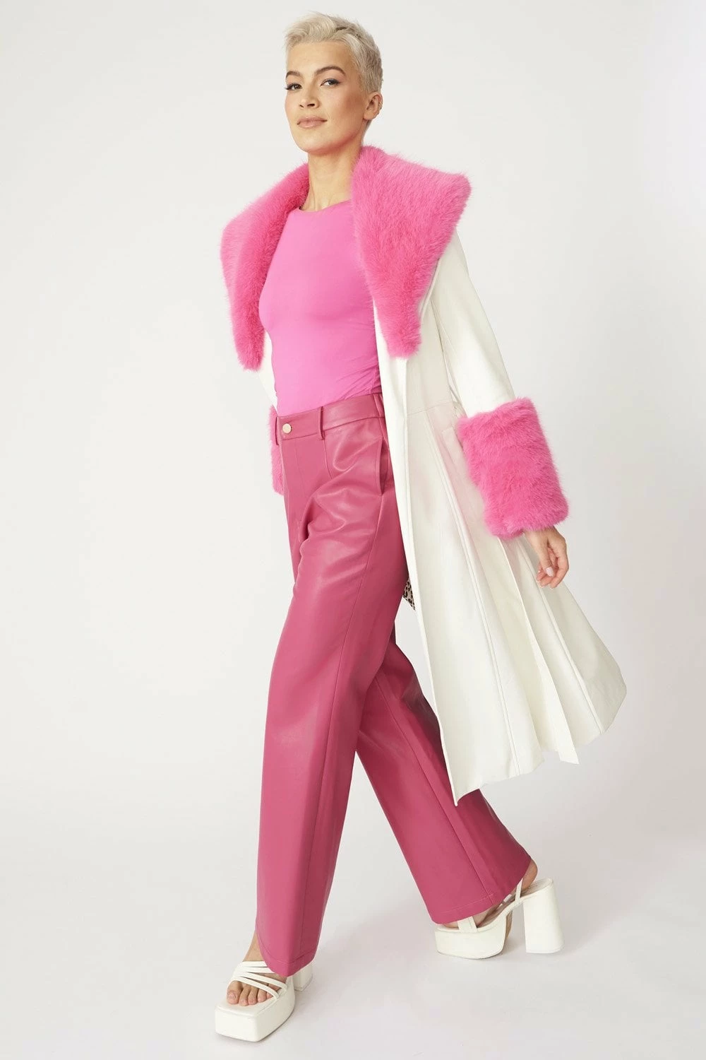 Super on-trend this pink midi-style trench coat will give you the vibes you need throughout the cooler weather. The brushed, soft, faux leather is embossed with snake print and features a detachable faux fur collar and cuffs so you get two looks for the price of one!