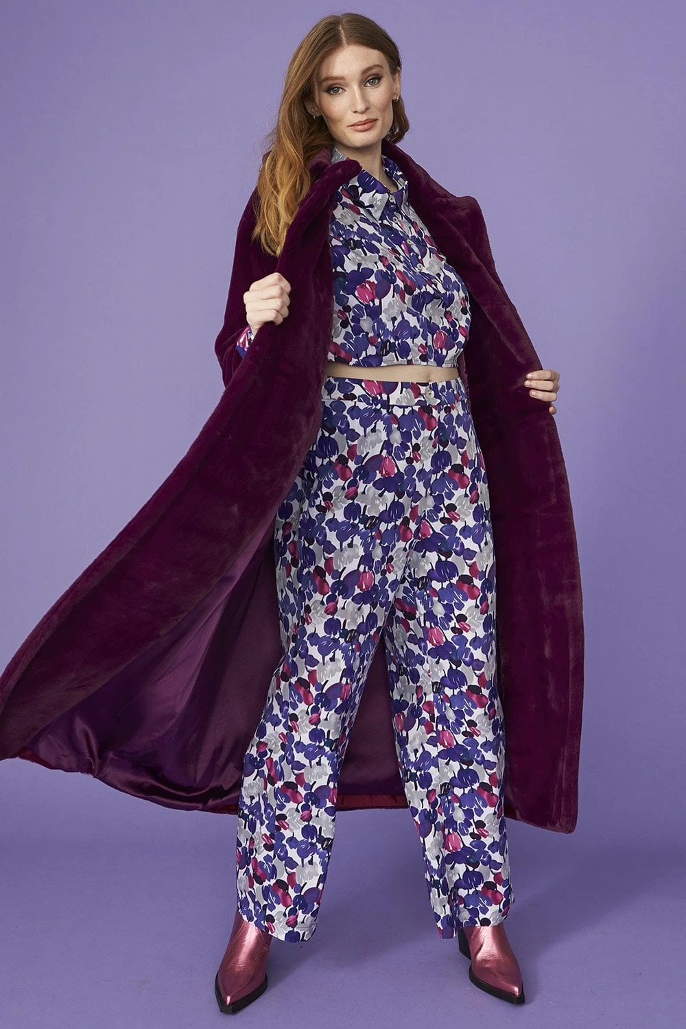 Maxi oversized faux fur coat, with deep, pattern lined pockets.