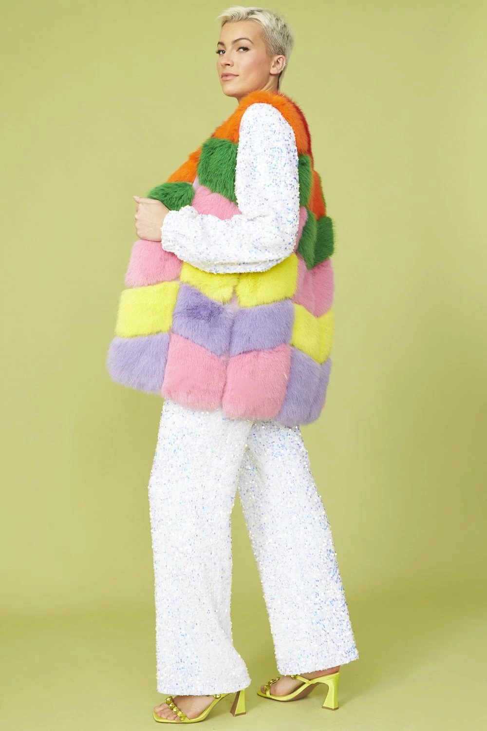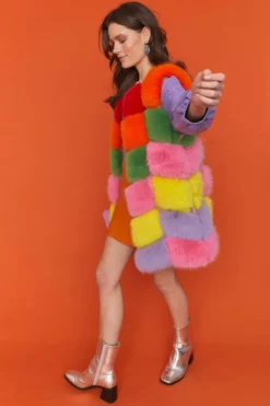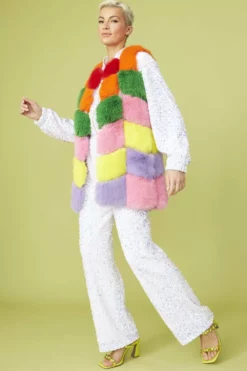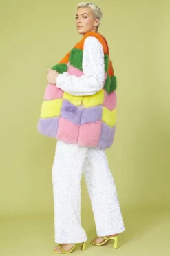 Expertly crafted from the finest faux fur, this gilet is beautifully designed with a blocked rainbow pattern. Accompanied with deep side pockets and hook and eye front fastening this coat is a real statement piece.