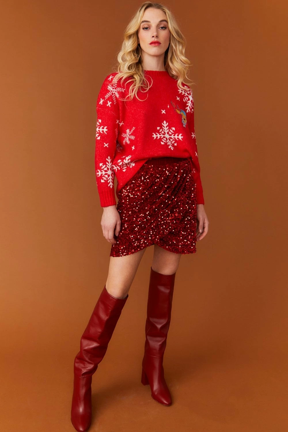 Red-tone velvety embellished mini skirt featuring sequin embroidery, a high elasticated waist, silk lining and a wrap over effect.