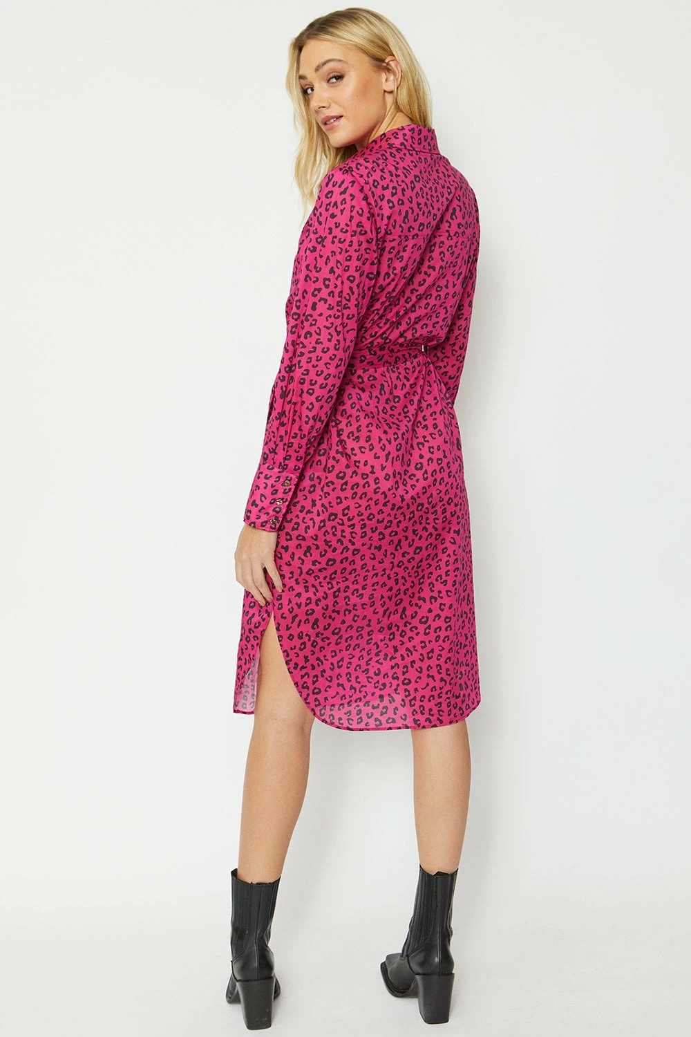 The perfect transitional piece, this feminine animal print button-down shirt dress is just what you need for transitioning into Summer This dress features a tie waist, frill hem, and full-length sleeves.
