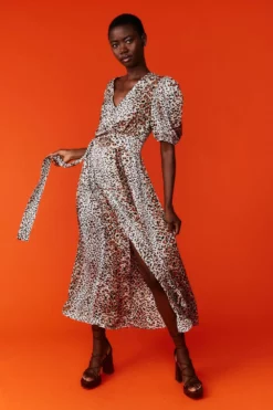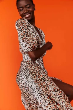 Effortlessly stylish from day to night, this bold animal dress is a sure showstopper. Our latest addition is a figure-flattering maxi wrap dress with square neck line and elasticated sleeves. Embrace your fun and feminine side with its wild animal print and timeless neutral tones and finish the look with a light coverup and heeled sandals to let this dress take centre stage.