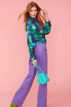 Stand out this summer with our gorgeous silk blend tie-dye blouse. It features an abstract print, funnel neck, Gathered waist, and ruched sleeves. This blouse is perfect for all occasions!