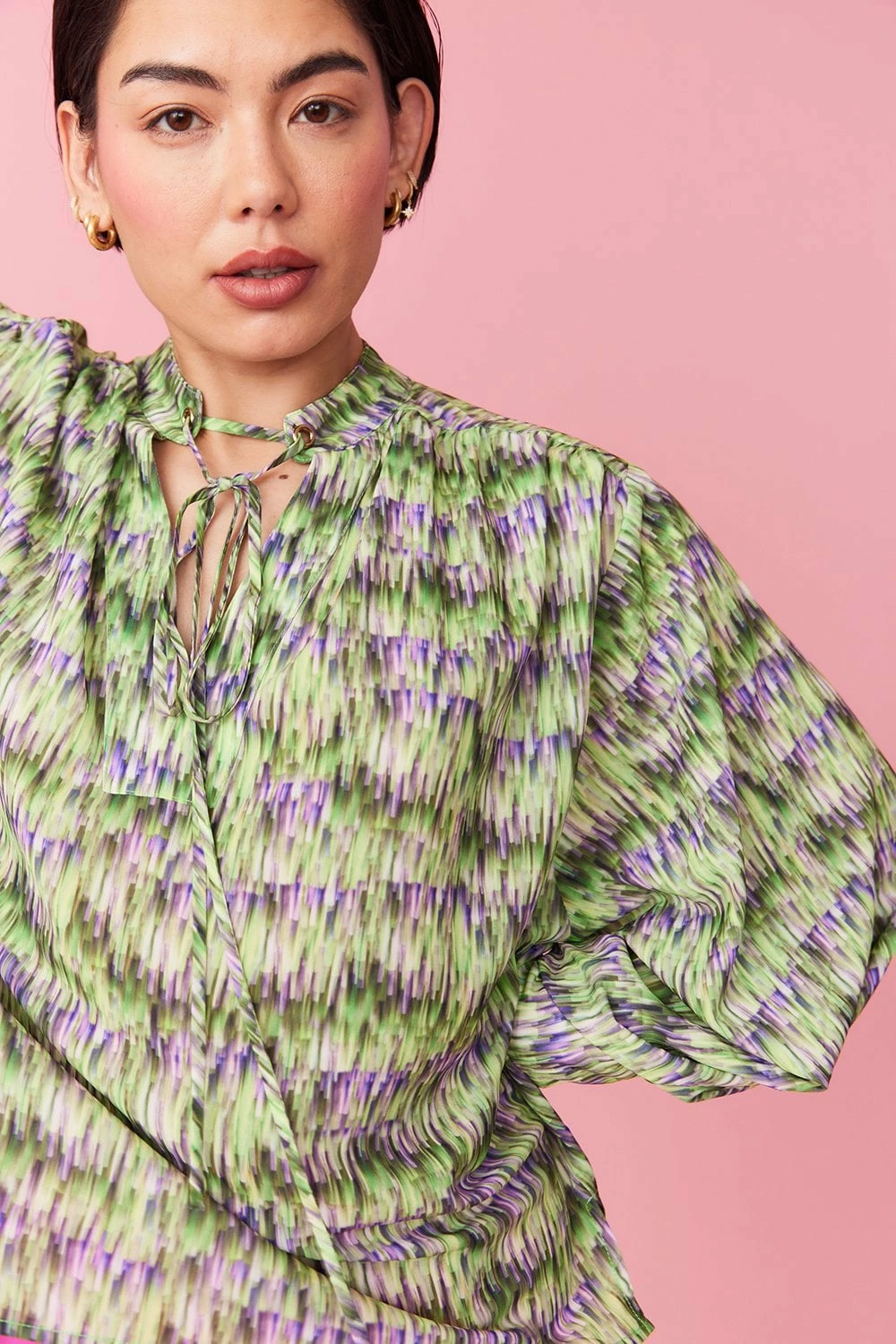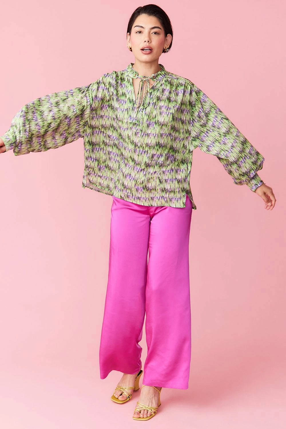 Stand out this summer with our gorgeous silk blend lace neckline blouse! It features an abstract print, lace-up neck detail and full-length sleeves. This blouse is perfect for any occasion!