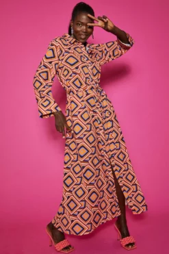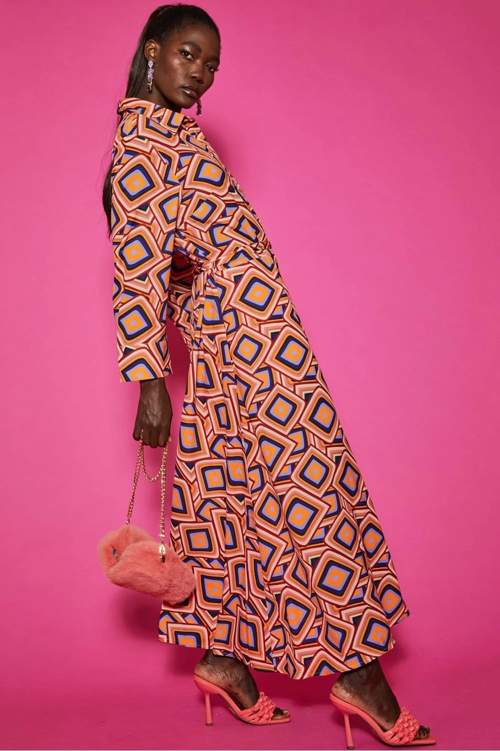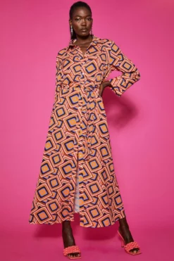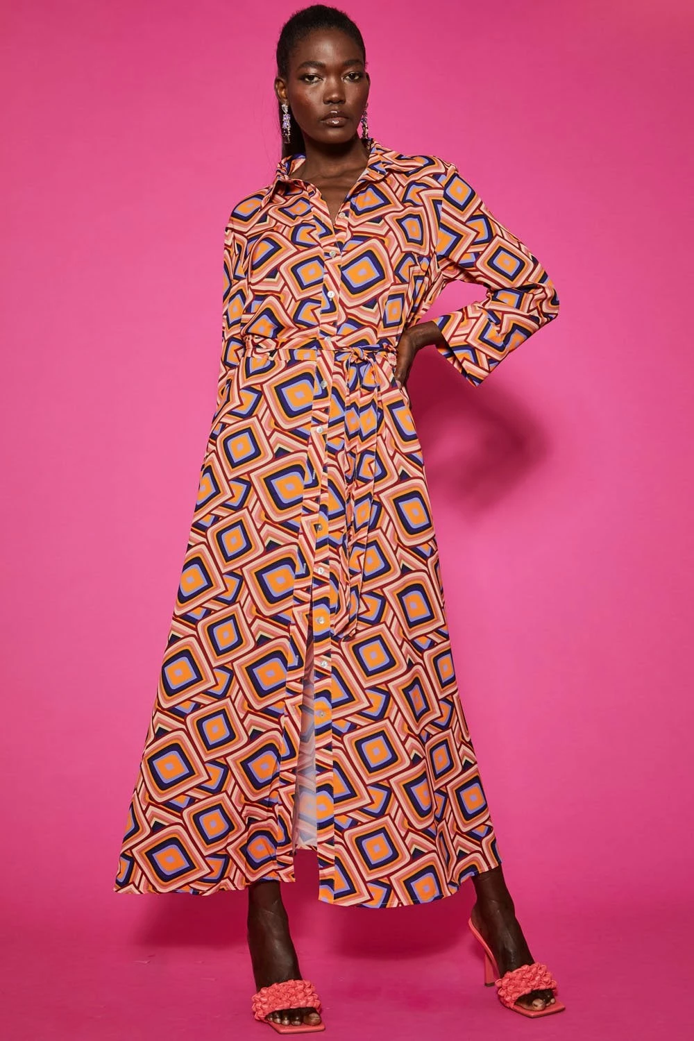 An Autumn must-have, this maxi shirt dress with long sleeves, classic collar, and belted waist is perfect for seeing you through the colder months. Featuring a flattering geometric print and pearl-like buttons.