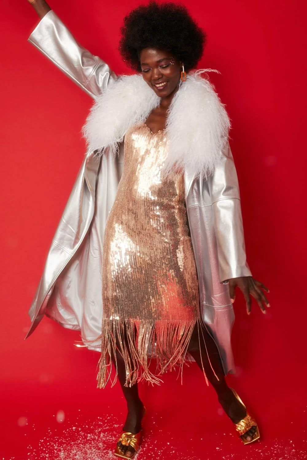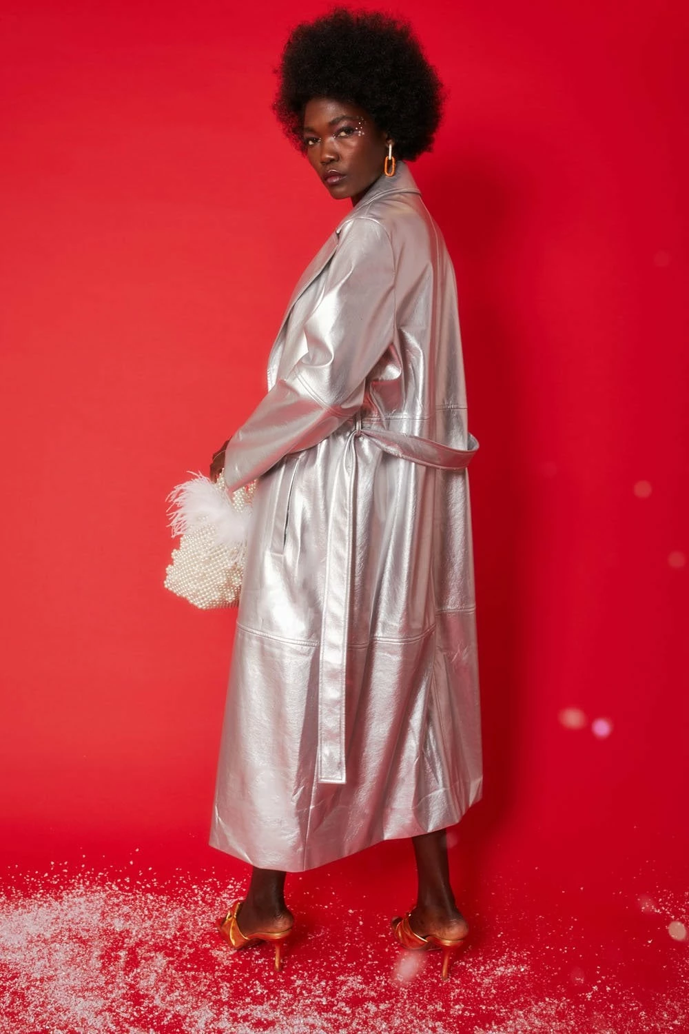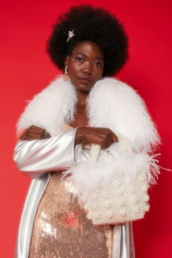 Super on-trend this Silver midi style trench coat will give you the vibes you need throughout the cooler weather. The reflective, soft, faux leather features a belt, pockets and classic style removeable Mongolian fur collar