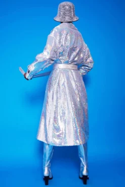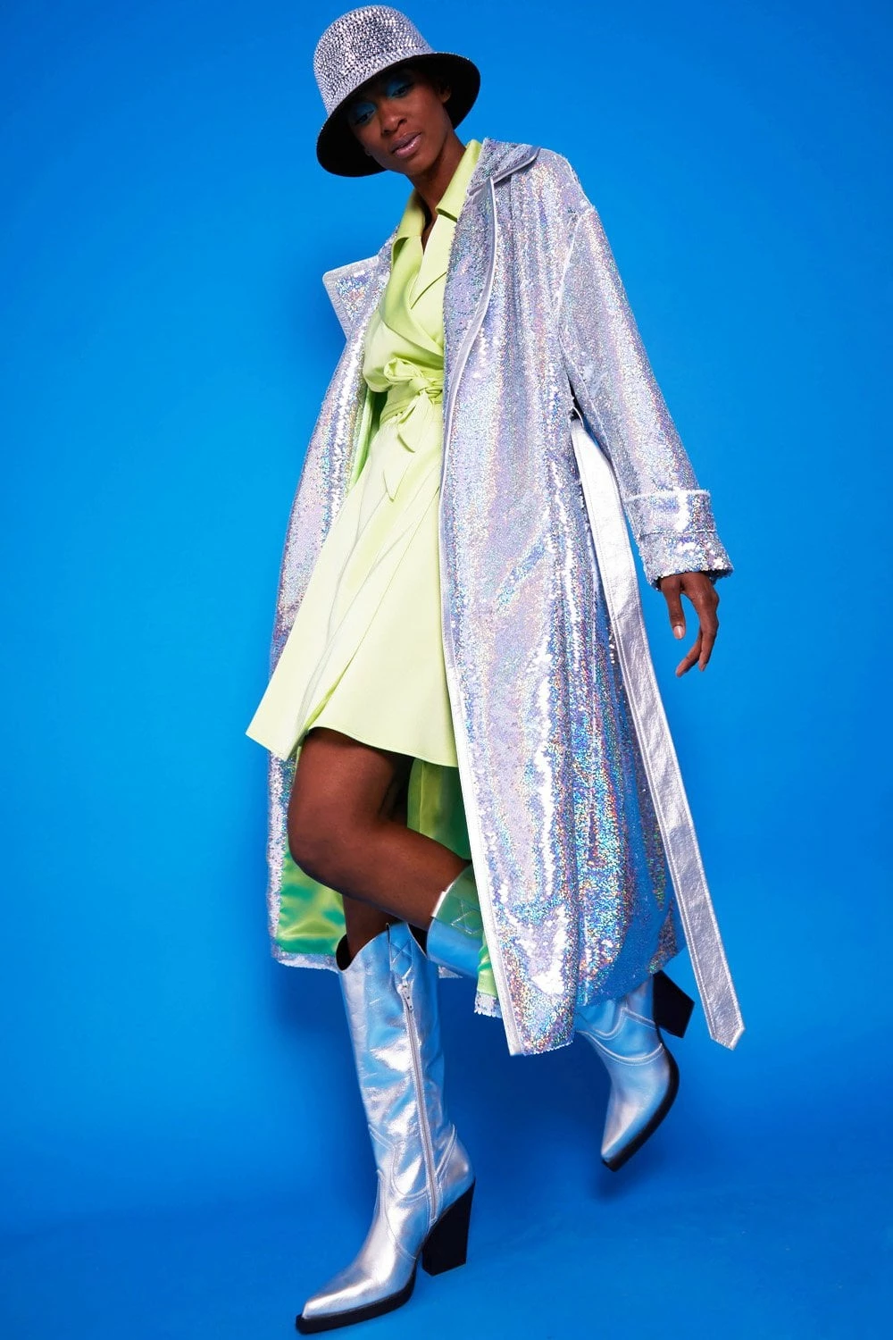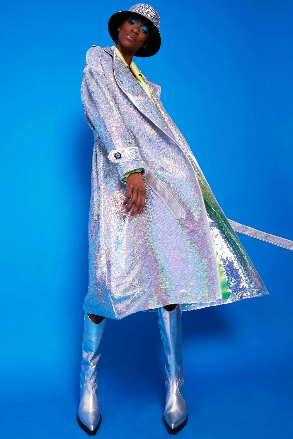 So much more than just a trench coat. This velvet trench coat is adorned with sequins, giving you a luxurious statement-making entrance!