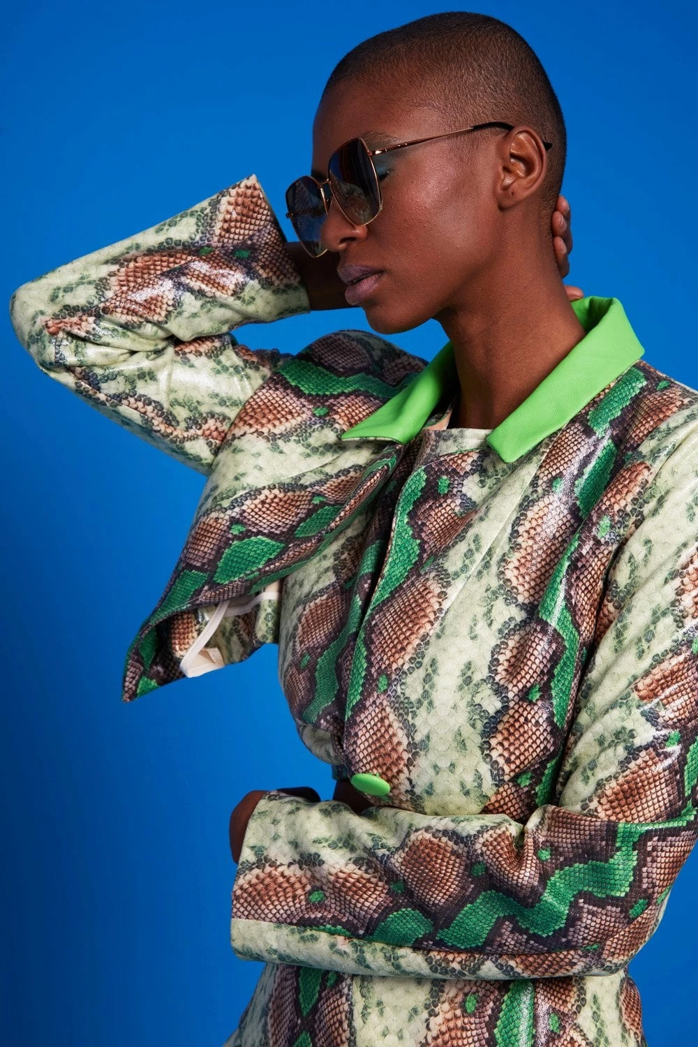 Bold and beautiful this faux leather snake print trench coat with lime green detail is perfect for the transitional season
