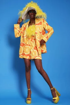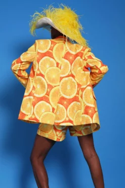 Step up your style game in our Orange print blazer. Cut in a regular fit, this blazer is double-breasted with two contact-striped pockets and an open revere collar. The transition from season to season in a fruity blazer by it with it’s matching co-ord shorts!