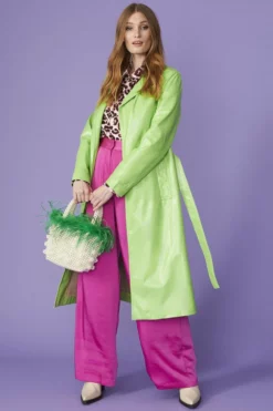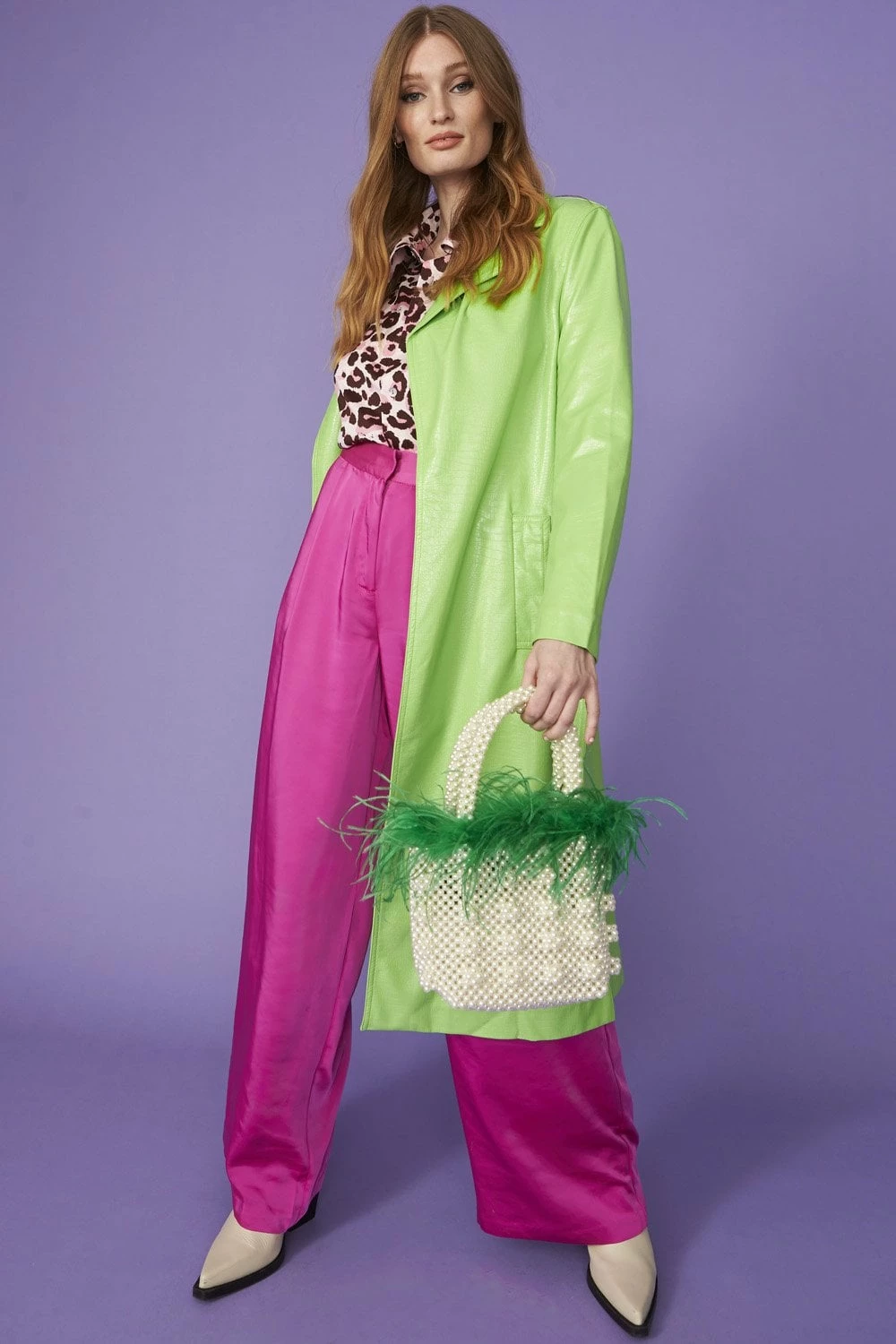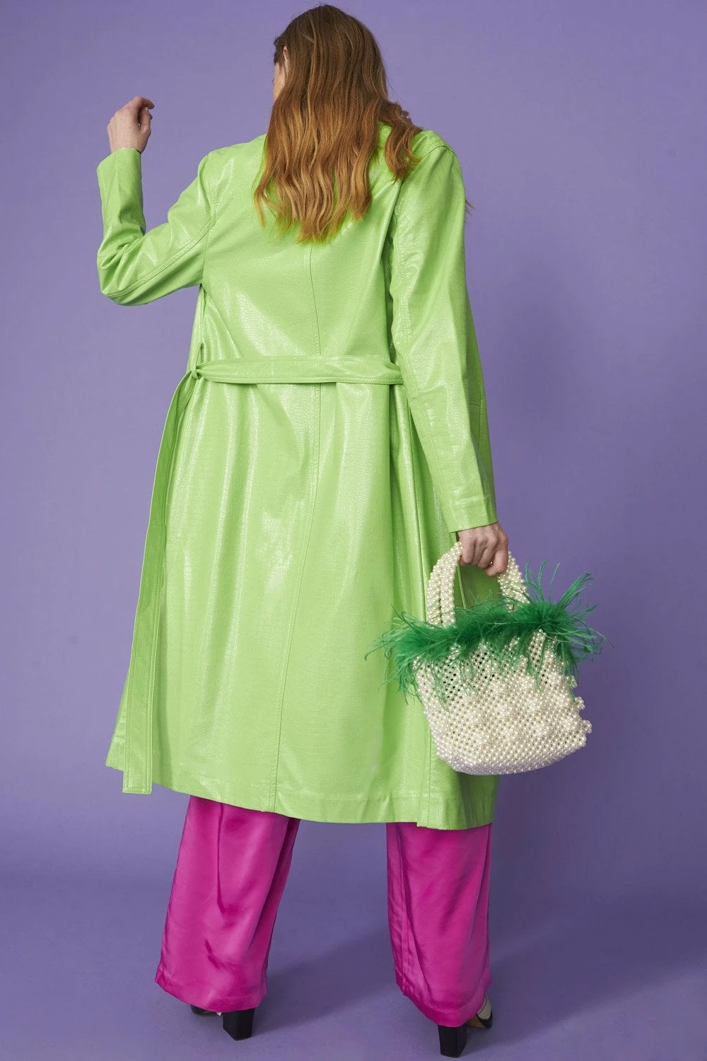 A coat for the limelight. This limegreen trench style coat is crafted from eco leather and is embossed with a faux croc print. With beautiful pearl button fastenings and classic buttoning, its easy to see why this jacket with be a statement piece of the season.