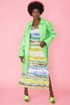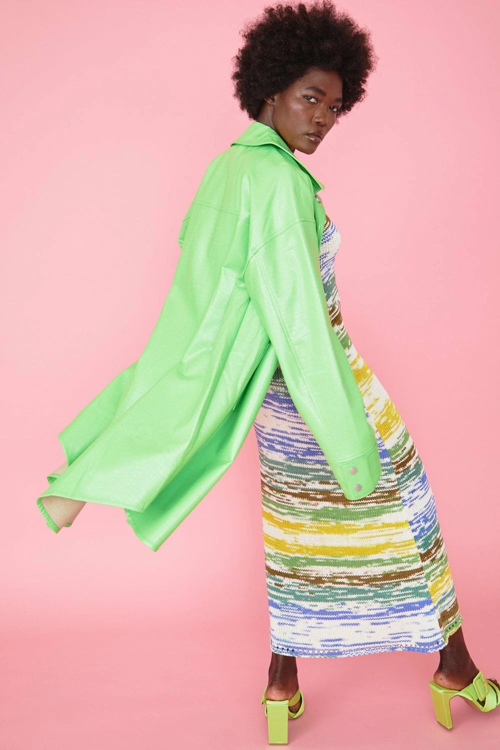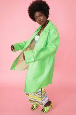 A coat for the limelight. This limegreen trench style coat is crafted from eco leather and is embossed with a faux croc print. With beautiful pearl button fastenings and classic buttoning, its easy to see why this jacket with be a statement piece of the season.
