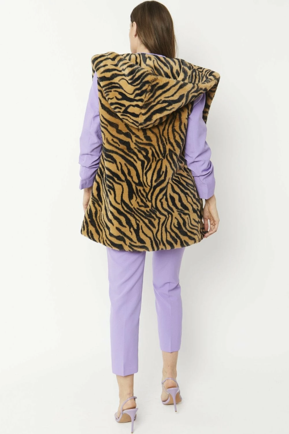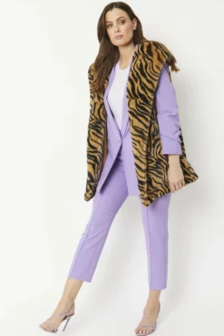 You’ll love this soft faux fur, animal print gilet from Jayley. Featuring an oversized hood which is fully lined with faux fur for extra warmth, working lined pockets and hook and eye fastenings.