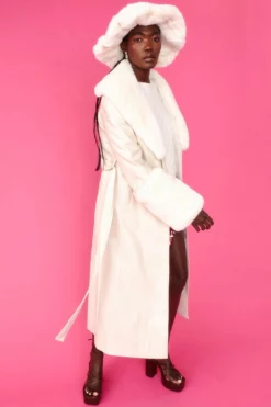 Our beloved Faux leather Coat with Detachable Faux Fur Detailing is back with a longer length upgrade. We know you’ll be as obsessed as we are. Our shiny faux suede coat with subtle animal print features luxuriously soft faux fur cuffs and a collar with side pockets its’ the perfect piece in any season.