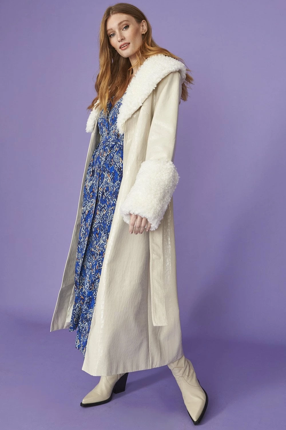 Our beloved Faux Suede Coat with Detachable Faux shearling Detailing is back with a longer upgrade. We know you’ll be as obsessed as we are. Our shiny faux suede coat with subtle animal print features luxuriously soft faux shearling cuffs and a collar with side pockets its’ the perfect piece in any season.