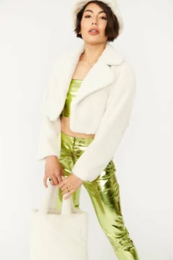 On-trend style and warmth, two of the key features of this faux fur cropped jacket, make it a timeless piece easy to wear all year round, so perfect to keep that summer breeze off your shoulders. Available in a variety of colours.