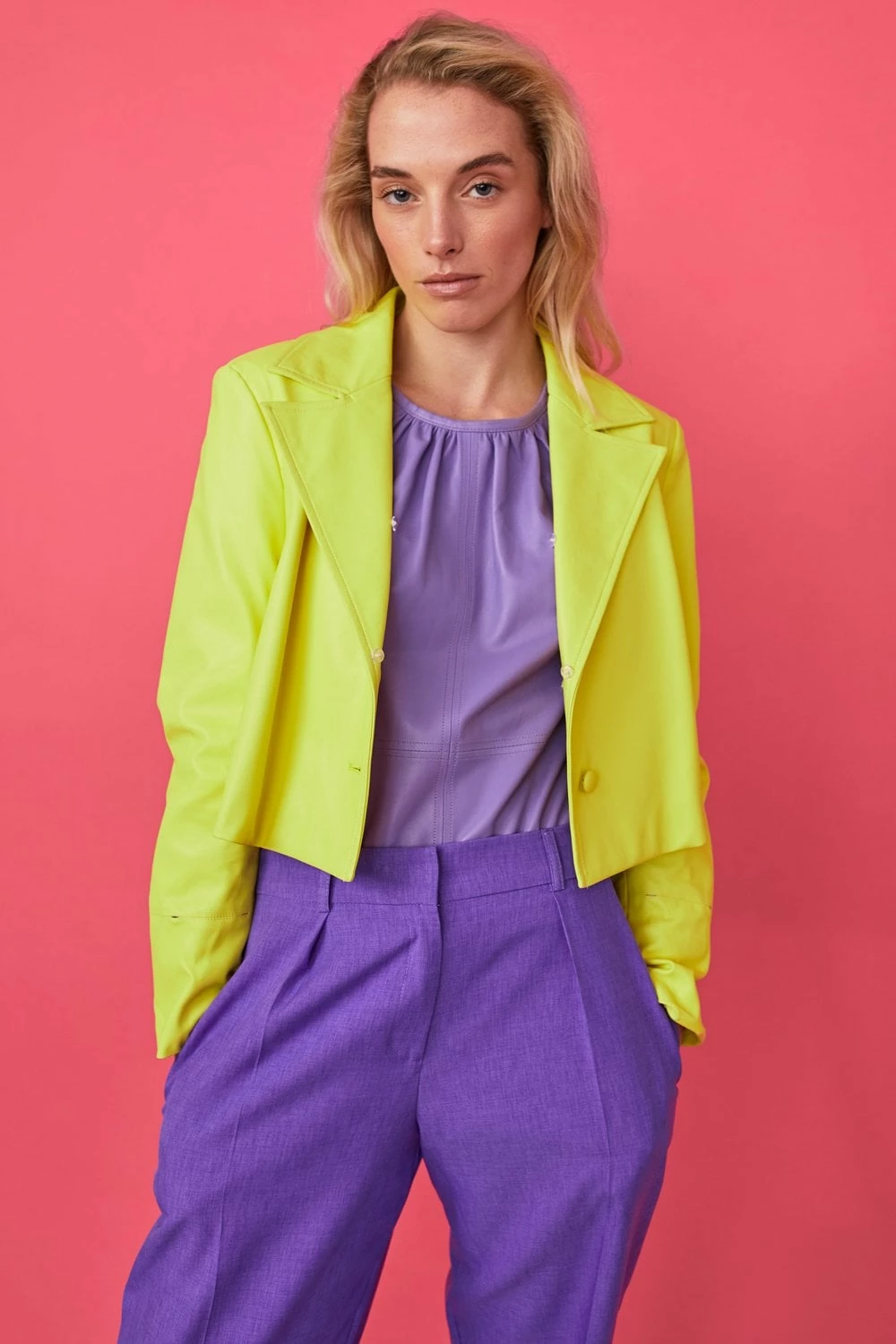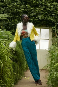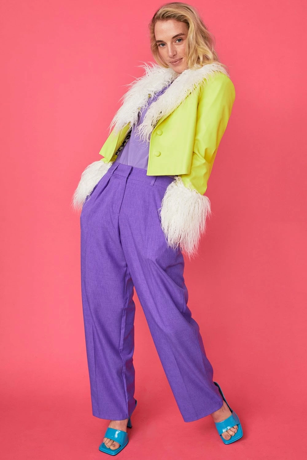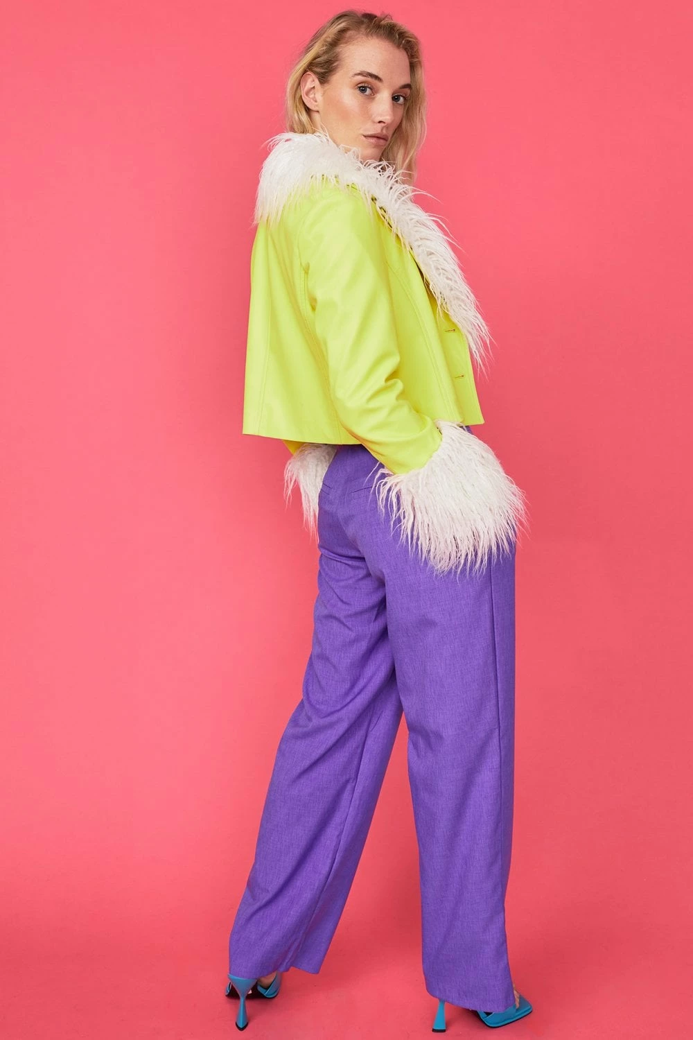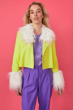 Stand out this season in our bold bright biker jacket featuring faux Mongolian fur collar and cuffs. A slightly cropped fit with a button front, this jacket is perfect for taking you from day to night in style.