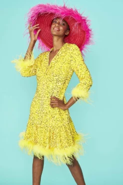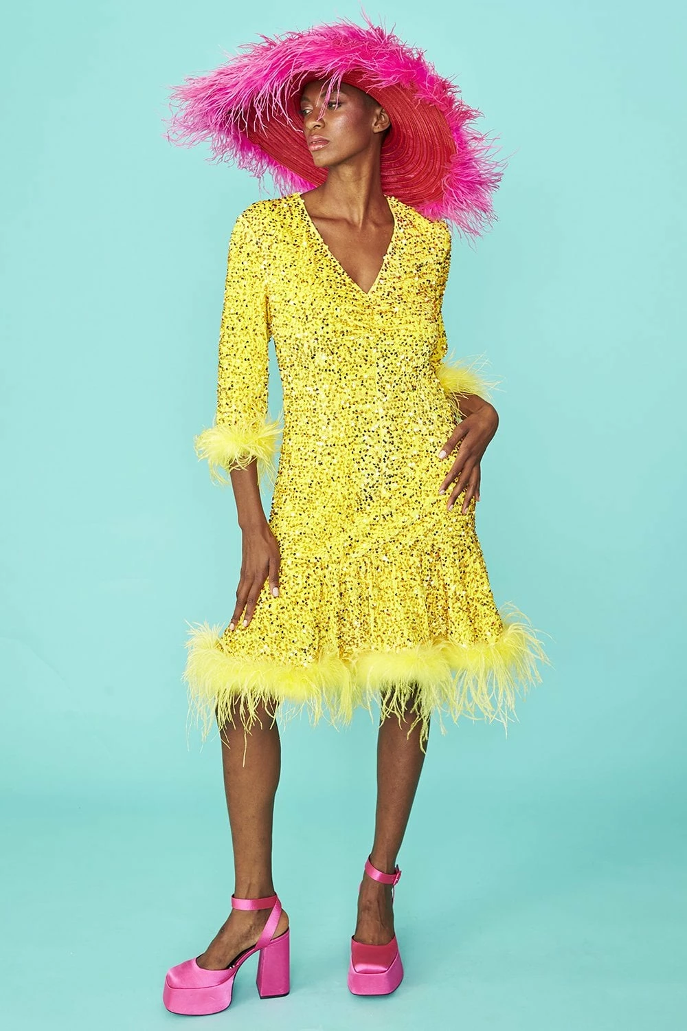 Upgrade sparkle season with this gorgeous skater sequin dress with feather trim on the sleeves and hem. This dress is crafted from our softest velvet which is adorned with yellow sequins.